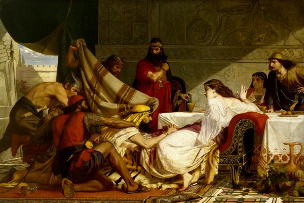 King Ahasuerus and Haman have second feast with Esther. On the second day, Esther reveals Haman's wicked plot. Haman begs for his life, but he is hanged on the gallows he had built for Mordecai.